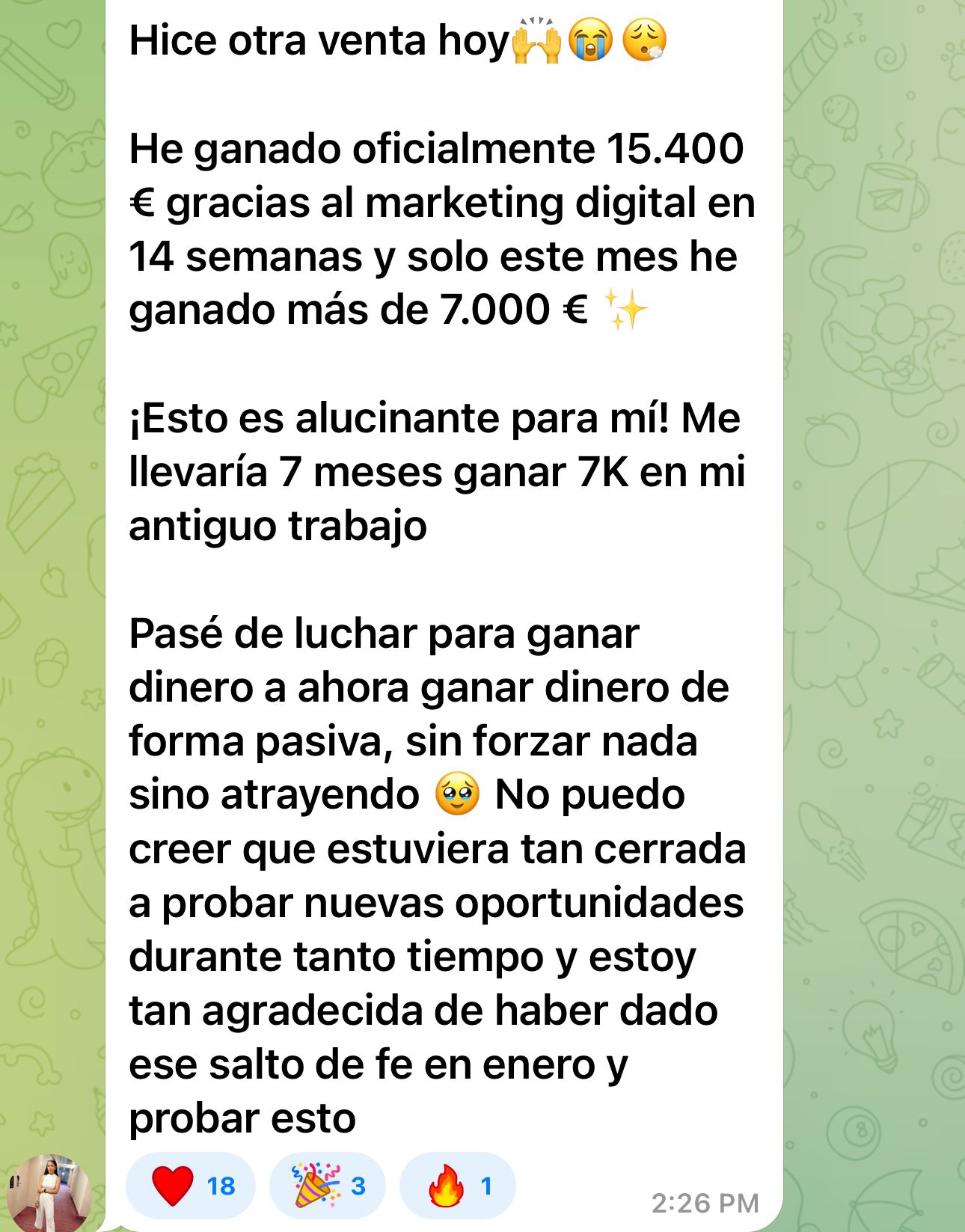 También tendrás acceso a mi grupo privado de Telegram donde tendrás mi asesoramiento y apoyo personal